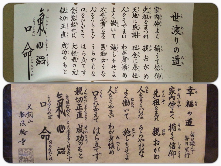 上段が叔母の家にあったもの、下段が蕎麦屋にあったもの。内容は世渡りの道の方が三行多いですがほぼ同じ。最後の漢字の書き方は全く同じ。