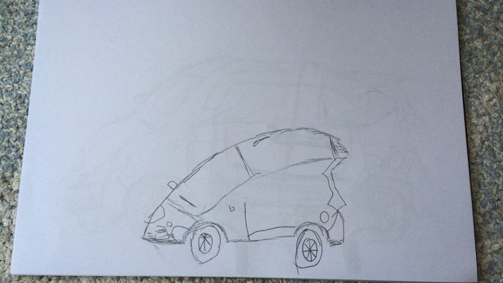 まだ時間があったので参加できそうなプログラムを探しダイハツ工業の「若手カーデザイナーによる車のスケッチ教室」へ。ダイハツミライースのミニカーを見ながらスケッチするのですが、長女は車を描いたことがなく、最初描いた絵はお世辞にも褒められるものではありません。