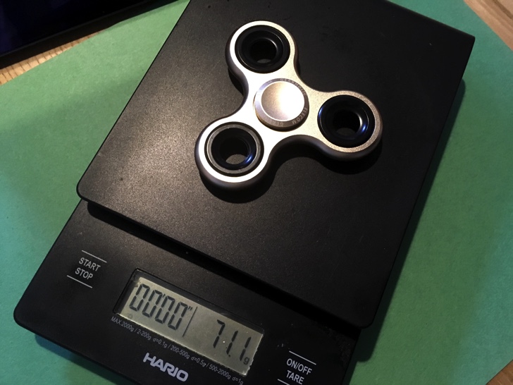 重量は箱には約66gと記載されていましたが、スケールで測ってみたら71.1gありました。ハンドスピナーとしては重い部類に入ります。ある程度重さがないと長い時間回りませんので、このぐらいの重さは必要でしょう。