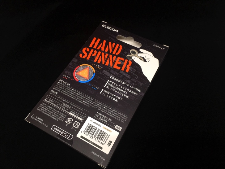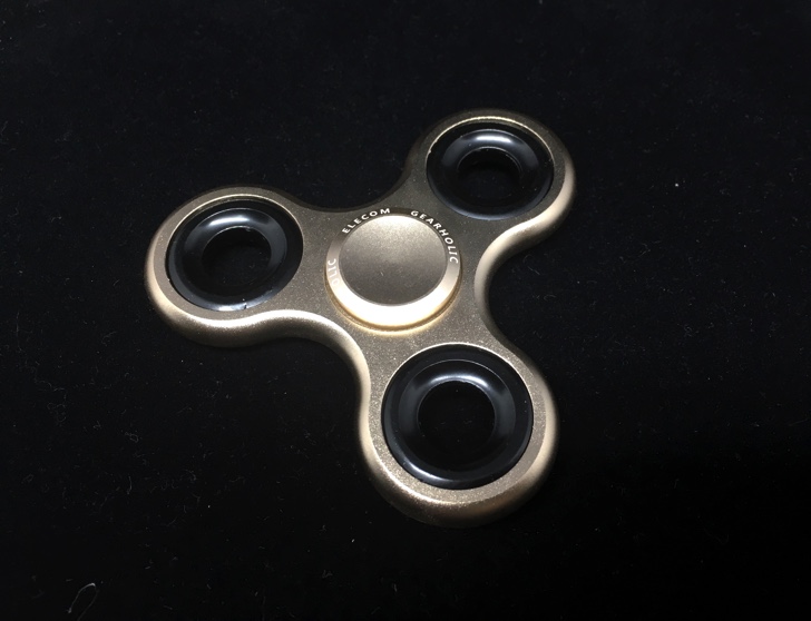 満を持して購入したのはマウスやUSBメモリなどのPC機器やイヤホンなどの製造メーカーELECOMの高回転ハンドスピナー。プラスティック製とアルミ製、また2枚羽と3枚羽がありますが、今回はアルミ製3枚羽のタイプを購入。カラーはゴールドをチョイス。工場が中国にあるため中国製ですが見た目からして安物とは違います。