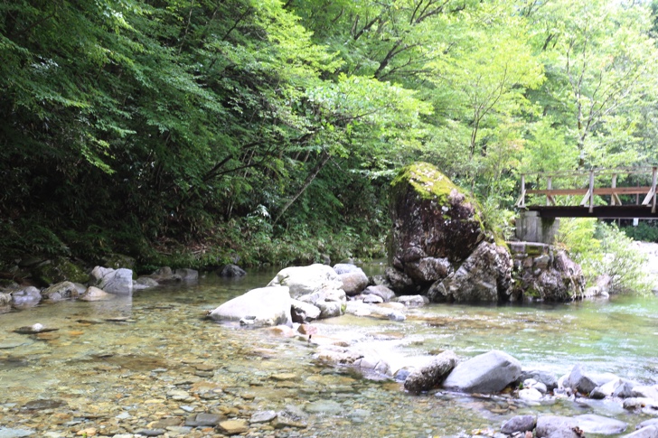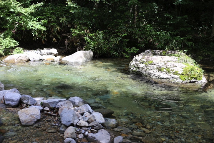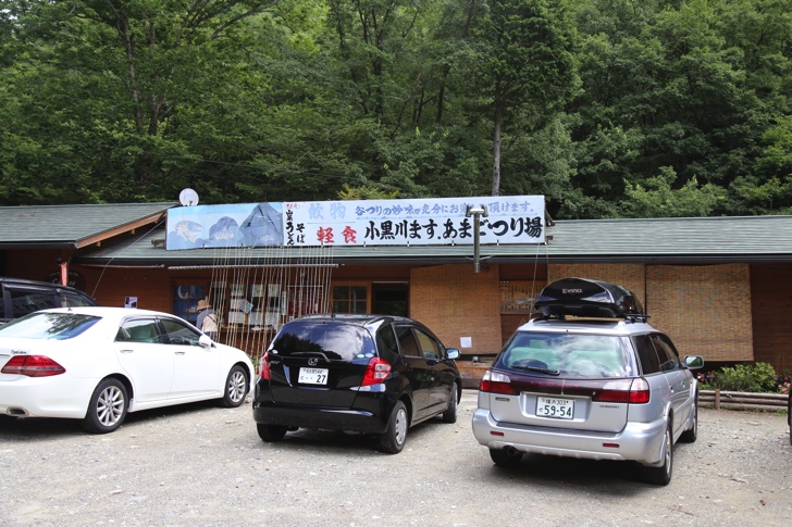 今回行った小黒川釣場は下呂出身の知り合いに教えていただきました。名古屋からは休憩を挟んで約3時間、下呂温泉から30分ぐらい行った所にあります。山間にあり標高が高いため、平地に比べると気温が低く快適。当日岐阜市街は35度を超える猛暑日でしたが、小黒川釣場付近は26〜27度ほど。