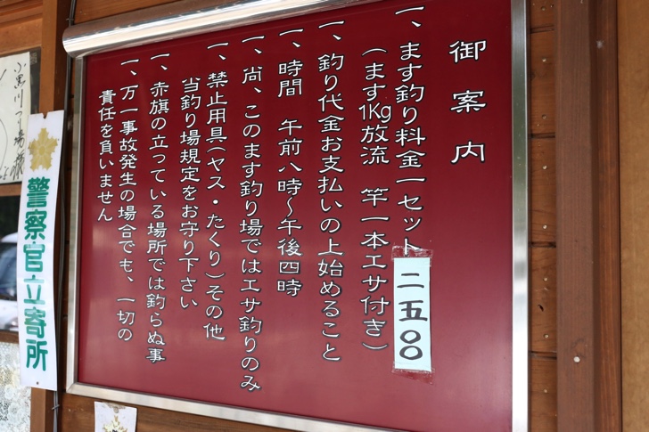 マイナスイオンたっぷりで空気も新鮮そのもの。透明度抜群の渓流でマスのつかみ取りや釣りが楽しめます。川沿いに石で囲った場所があり、ここに生け簀に入れてあるマスを移してつかみ取りを楽しみます。料金は9匹で2,500円。キャッチ&リリースは何度でも構いません。