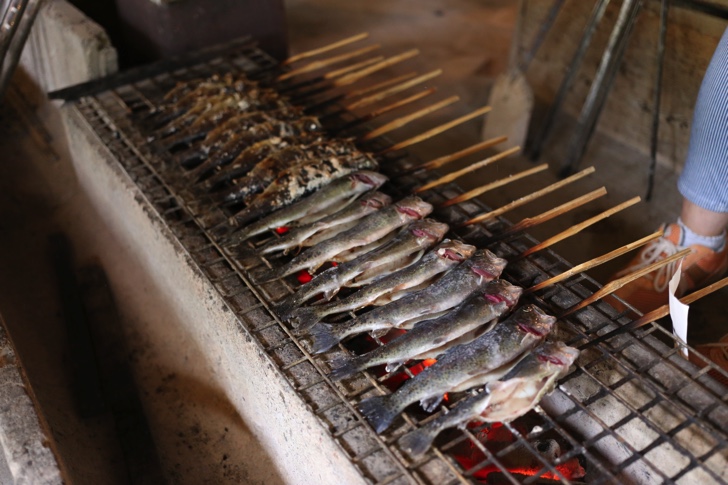まず10歳の長女が捕獲することに成功。続いて7歳の次女もなんとか2匹捕まえることができました。捕まえたマスは持ち帰ることもできますし、その場で焼いて食べることもできます。焼く場合は1匹100円ではらわたを処理し炭火で焼いてくれます。食事は川の上にあるテーブル席で食べることができます。