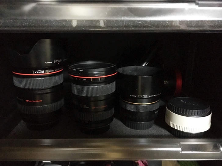 2段目は広角ズームレンズEF17-40F4L、EF24-105F4L IS、単焦点レンズEF50mmF1.4とテレコンバージョンレンズを保管。
