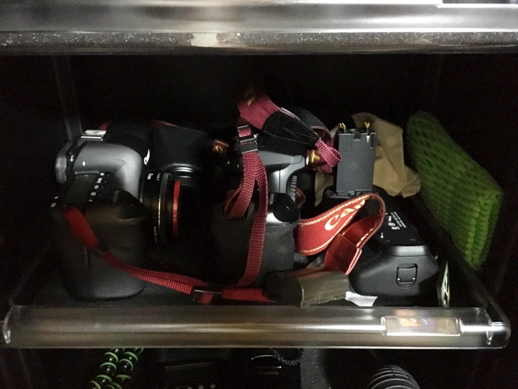 3段目はEOS6D+EF40mmF2.8、EOS40Dとそれぞれのバッテリーグリップを保管。近日中に40D は処分して6Dmk2に買い替える予定。