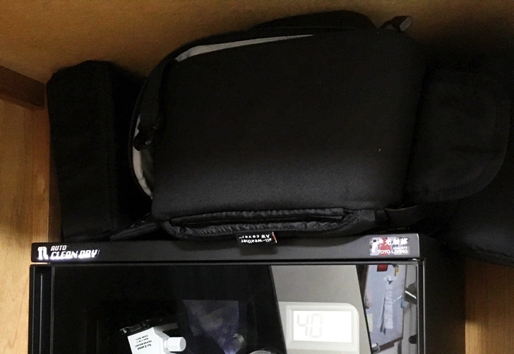 標準で防湿庫の天井に人感センサー付LEDライトがあるので、暗い場所でも問題ありません。使い終わった後はクロスでレンズを拭き、エアダスターで埃を落としてから収納しています。防湿庫の上にはワンショルダーカメラバッグの保管スペースになっています。