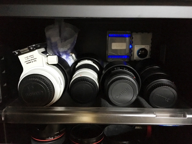 もし、これから一眼レフデジカメで本格的に撮影しレンズが増えそうな方は、思い切って専用防湿庫を買いましょう。カビが生えてからでは遅いですし無駄な出費は抑えた方が賢明。写真でお分かりかと思いますが、この防湿庫の容量ではもうレンズを新たに購入し保管するスペースがありません。あと1本ぐらいは何とか入るかもしれませんが…。とりあえず、今のレンズラインナップでほぼ撮りたいものはカバーできておりますが、これ以上レンズ沼に溺れないようにしないと。