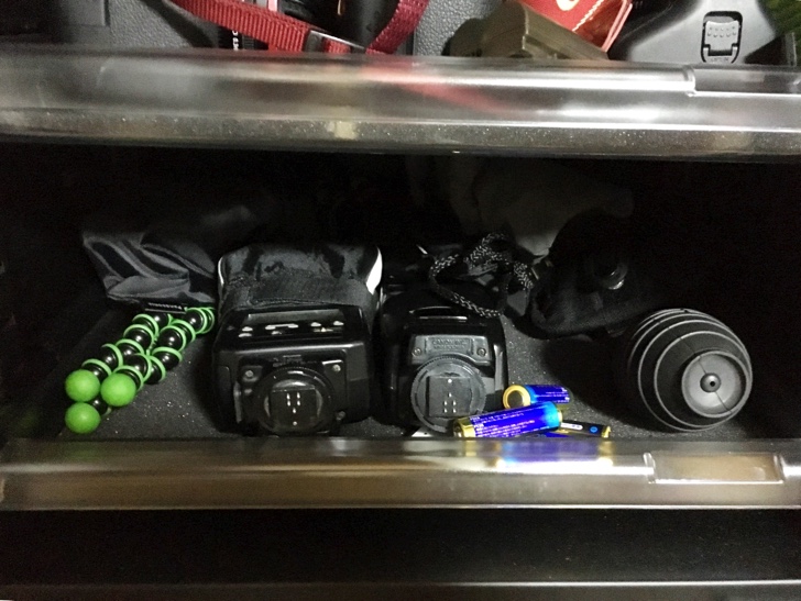 4段目はストロボ、エアダスター、バッテリー、レリーズケーブルなどの小物を保管しています。
