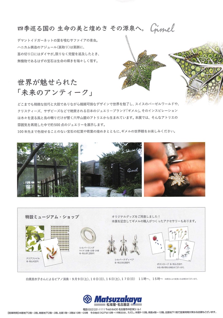 今回の展覧会は精緻な技巧と大胆でありながら繊細可憐なデザインで世界を魅了し、スイスのバーゼルワールドや、クリスティーズ、サザビーズなどで絶賛される日本のジュエリーブランド「ギメル」の特集。