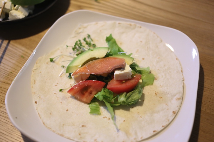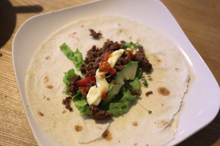 とうもろこしをすり潰して作られた「トルティーヤ」という薄いパン生地が市販されていますので、これをフライパンで軽くあぶり、その上に好きな具材を乗せていきます。