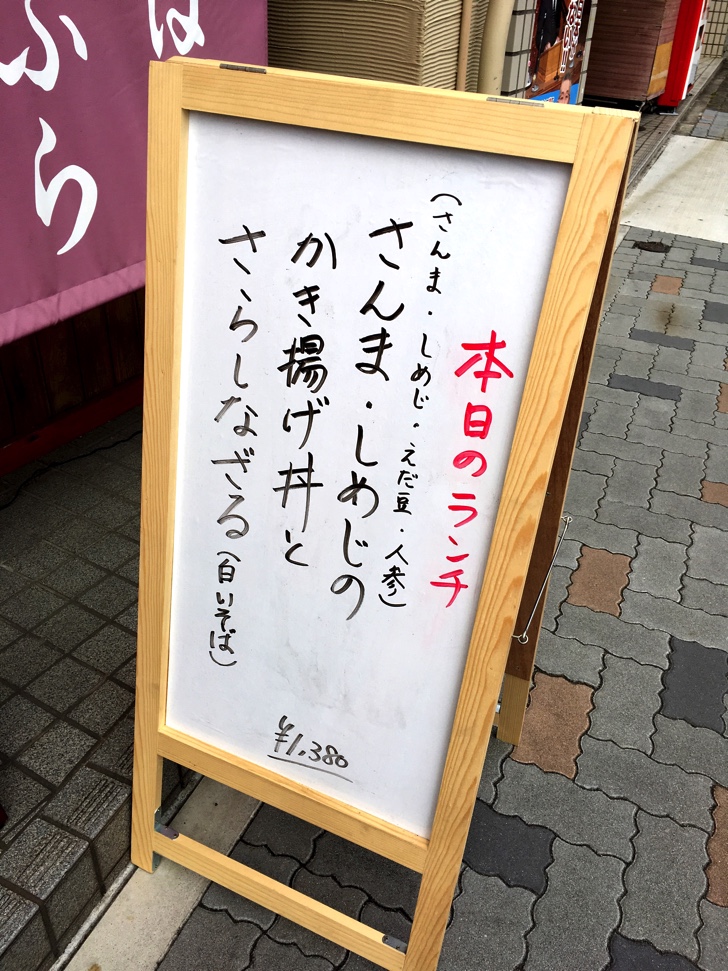 今回は、本日のランチの「さんま・しめじ・えだまめ・人参のかき揚げ丼とさらしなざる」と「冷やし鴨南蛮そば」を注文。