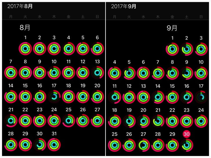 アクティビティを月間で一覧することができます。9月から職場が変わり、8月に比べて運動量が減ったことがひと目でわかります。今月はもう少し運動量を増やします。
