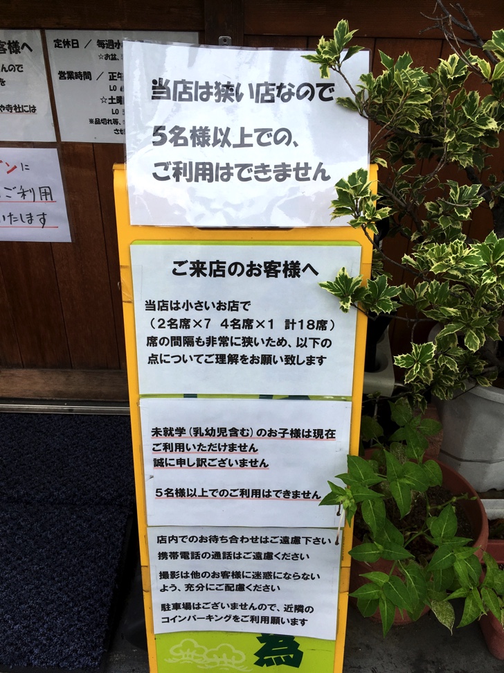 狭い店なので、5名様以上での利用はできません。また未就学児を連れての入店もできません。また専用の駐車場はありませんので、車で訪れた場合は近くのコインパーキングに停めるか、公共交通機関で訪れましょう。目の前の道路は駐車禁止のためすぐ切符を切られますのでご注意あれ。