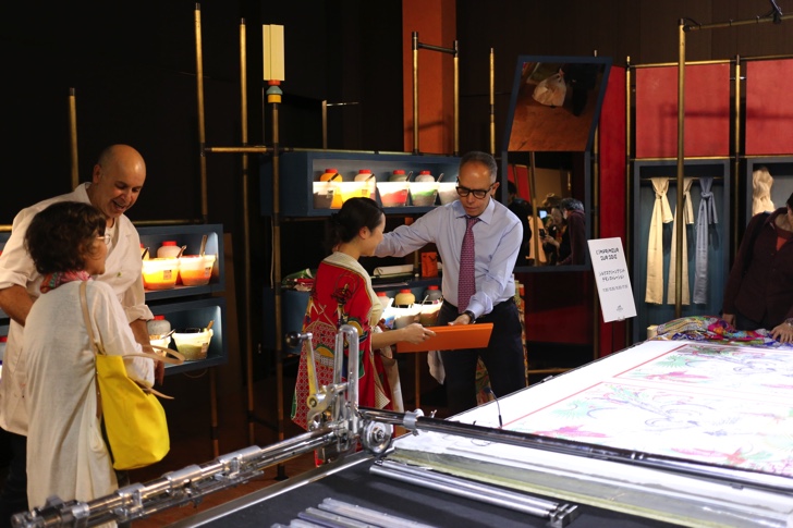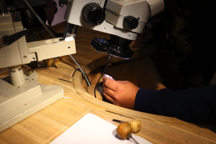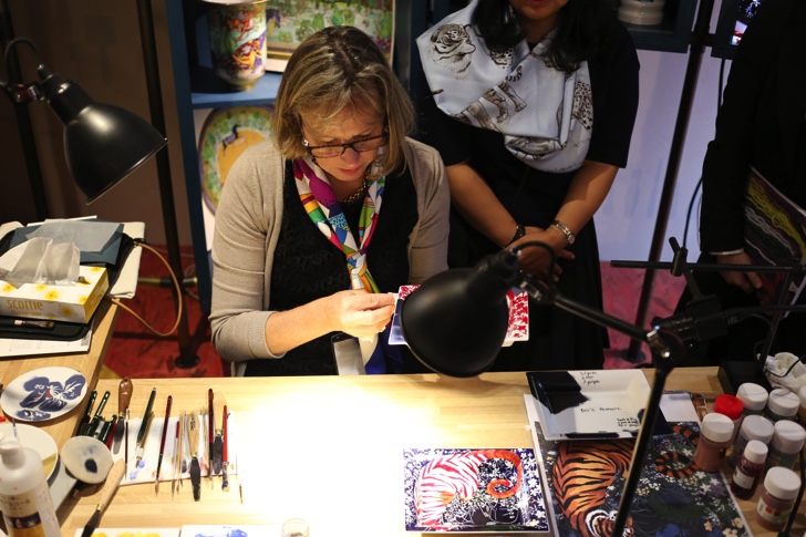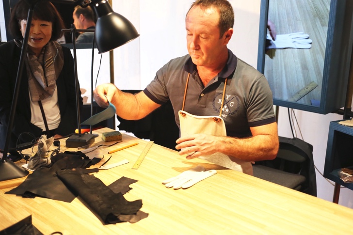 各ブースは入口に近いところから3部屋に分かれて「石留め職人」「時計職人」「磁器絵付け職人」、「手袋職人」「皮革職人」「鞍職人」、「ネクタイ縫製職人」「縁がかり職人」「シルクスクリーン製版職人」「シルクスクリーンプリント職人」の順で配置されています。どのブースにも現地から職人の方が来られていて、説明しながら作業をされていました。通訳が一人ずつ付いているのでフランス語が分からなくても大丈夫。特に人気があったのはバッグなどを作っている「皮革職人」のブース。2重、3重の人だかりができていました。