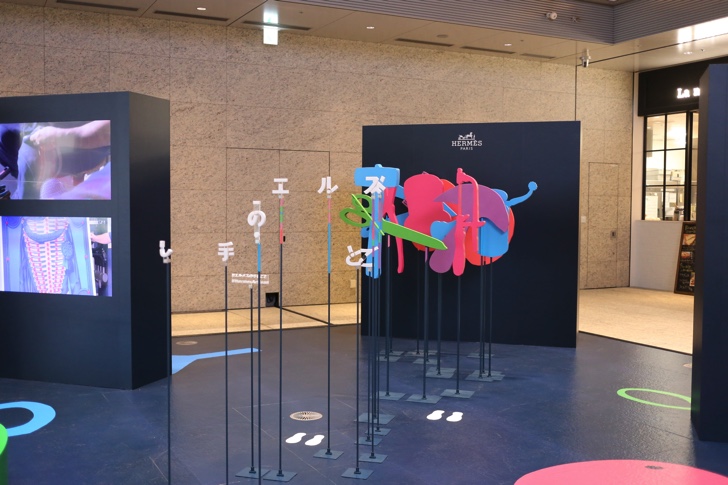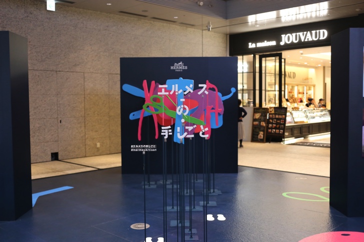 JPタワー名古屋の1階ホールでは撮影スポットが用意されています。特定の一箇所から撮影すると「エルメスの手仕事」というタイトルが浮かび上がるようにデザインされていて、色彩も超オシャレ。