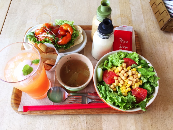 ランチメニューはホットドッグとサラダ、スープ、フライドポテトとドリンクがセットになって日替わりだと860円、自分で好きなホッドドッグをチョイスするランチだと1,000円ぐらいからになります。お皿や盛り付けも超イケていて、フォトジェニックなので、ついついインスタにあげたくなります。