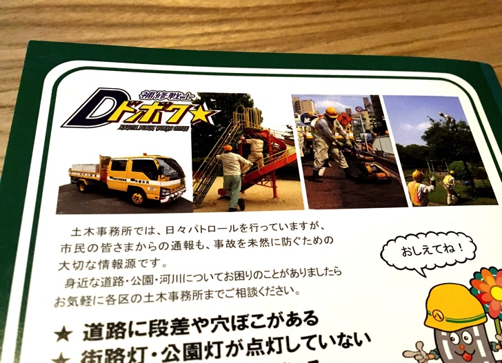 アメコミ風の土木作業服を着た男女が描かれています。表面の「ゴゴゴゴ」とジョジョ風の文字や、裏面のガンダム風の「補修戦士ドボク」など、企画した人はアラフォー男子に違いありません。