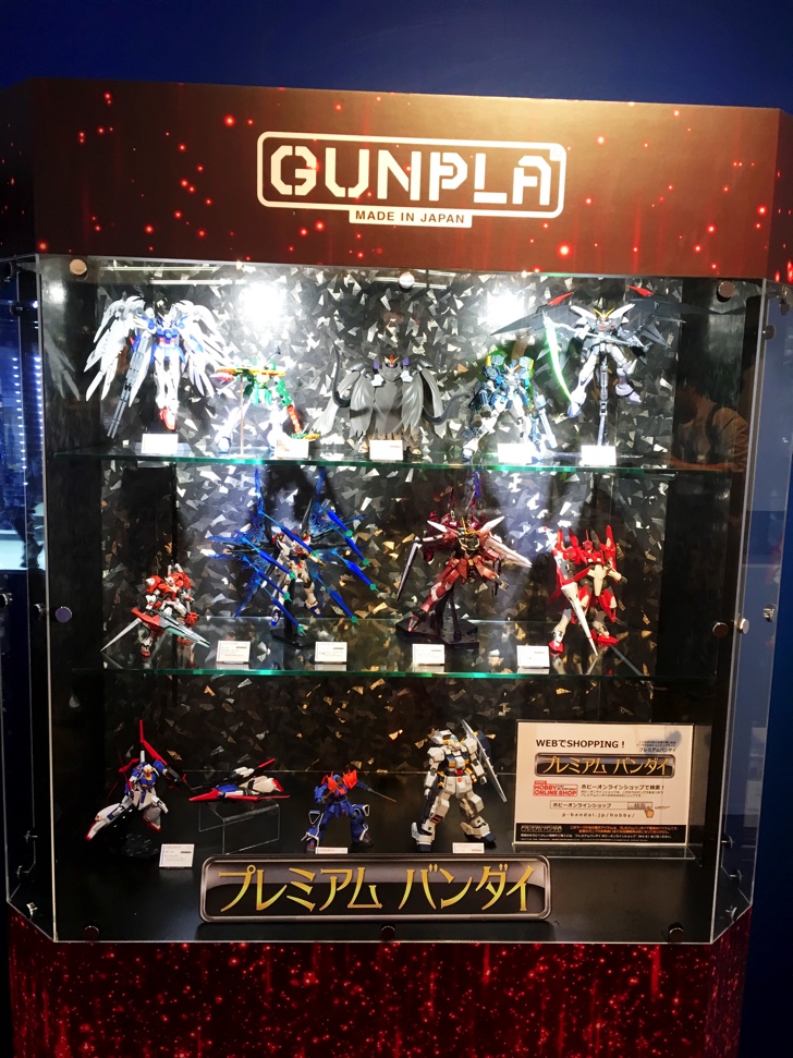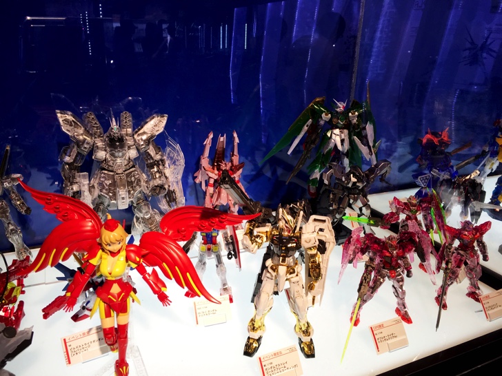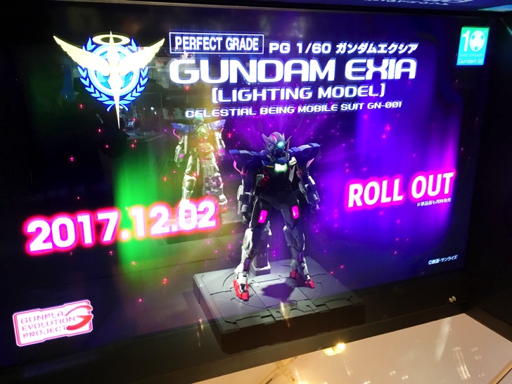 中ほどでは10月以降発売のガンプラなど最新アイテムを展示。気になったのは既に発売されている1/48メガサイズモデル 機動戦士ガンダムUC ユニコーンガンダムと実際に光るガンダムエクシア。こちらはガンダムダブルオー10周年の記念モデル。光る機構の完成度にも驚きましたが、ガンダム00の放映から10年経ったことも驚き。ドはまりしていたのが、ついこの間のような気がしますが、時が流れるのは早い早い。