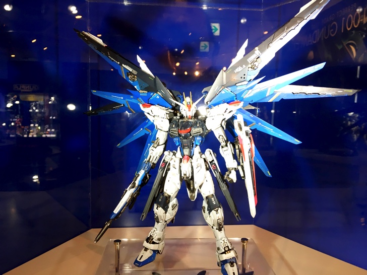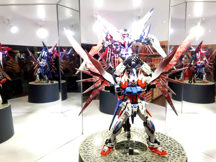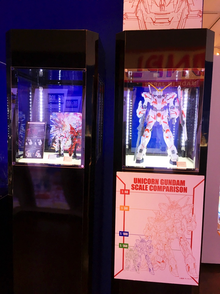 中ほどでは10月以降発売のガンプラなど最新アイテムを展示。気になったのは既に発売されている1/48メガサイズモデル 機動戦士ガンダムUC ユニコーンガンダムと実際に光るガンダムエクシア。こちらはガンダムダブルオー10周年の記念モデル。光る機構の完成度にも驚きましたが、ガンダム00の放映から10年経ったことも驚き。ドはまりしていたのが、ついこの間のような気がしますが、時が流れるのは早い早い。
