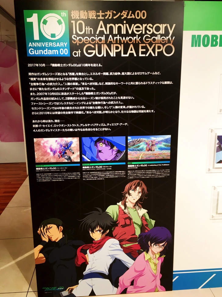 会場から少し離れた所にはオーガンダム00の特集コーナーがあり、こちらも見逃せません。ファーストガンダム、Zガンダム、ZZガンダム以降しばらく遠ざかっていましたが、このガンダム00で久しぶりにガンダムの世界に戻ってきました。大人が観ても十分に楽しめるシリーズでAmazonプライム会員なら無料で鑑賞できます。