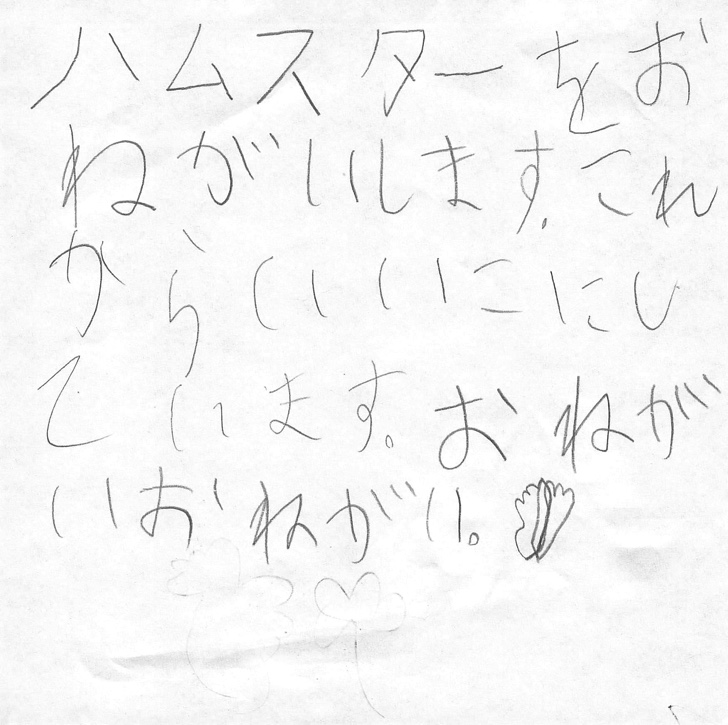 本を読んだらゴールデンハムスターより、ジャンガリアンハムスターの方が懐きやすくて抱っこできると知ったらしく、またお手紙が。