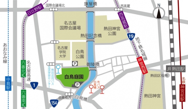 地下鉄名城線『神宮西』駅下車。4番出口より徒歩10分。白鳥橋を渡ってすぐを右折