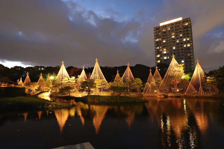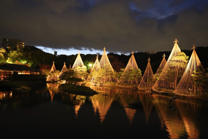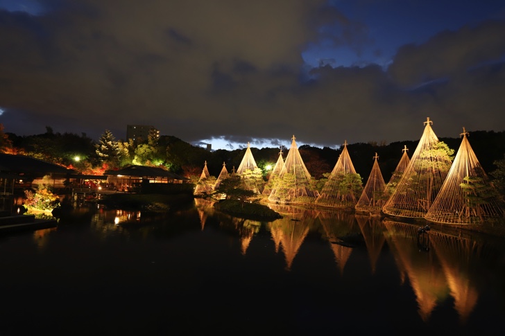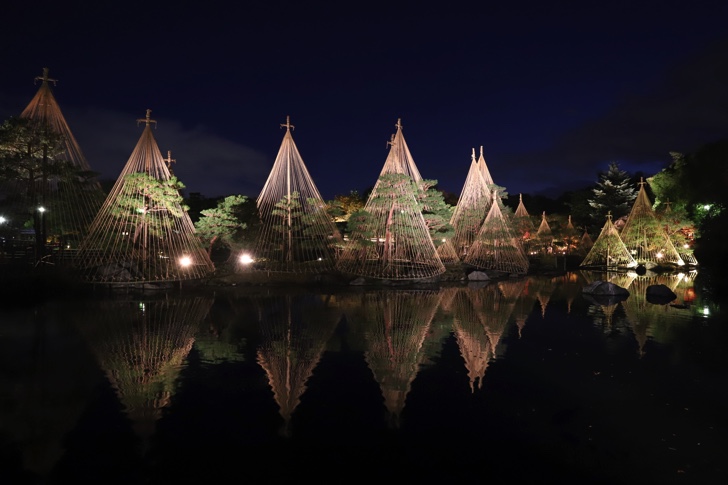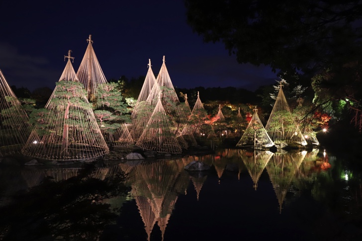 松の雪吊りや紅葉した木々が水面に反射し幻想的な風景を作り上げます。