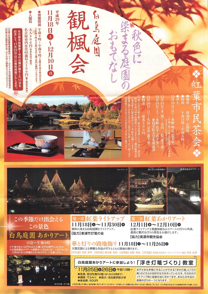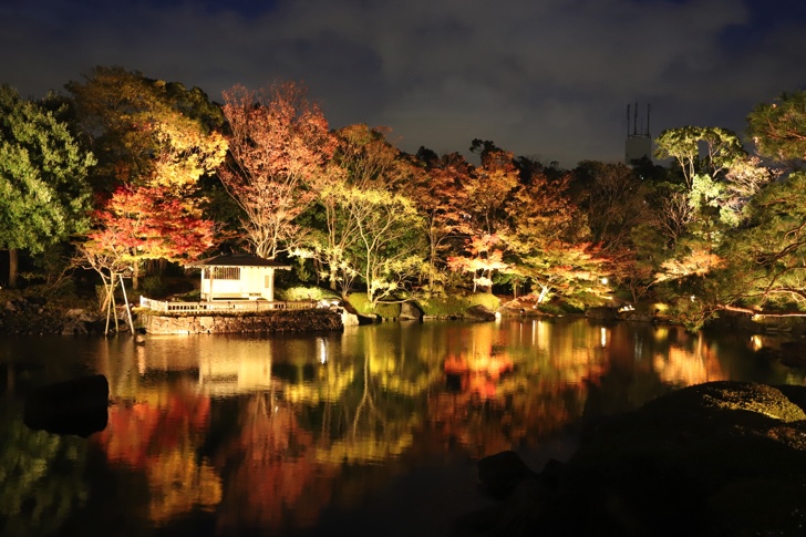 紅葉が見頃を迎えました。名古屋市熱田区の白鳥庭園では毎年この時期にライトアップが行われます。今年は11月18日(土)〜12月10日(日)、ライトアップは每日午後9時までとなっています。