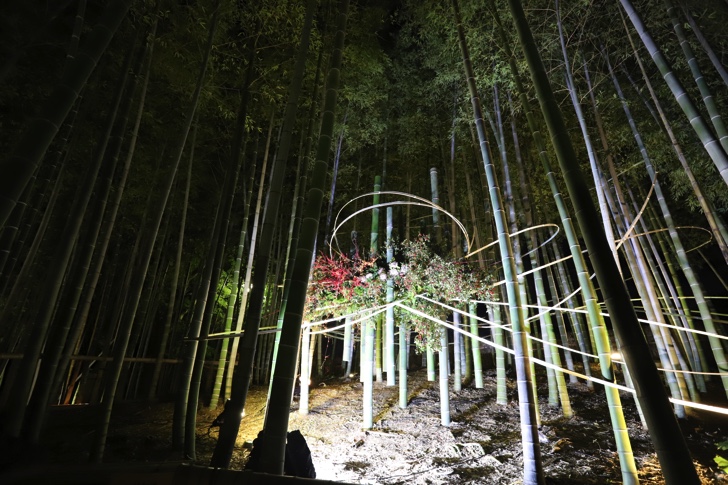 紅葉はもちろん、竹林もライトアップされていてとても素敵。竹林の真ん中にはいけばなが飾ってありました。