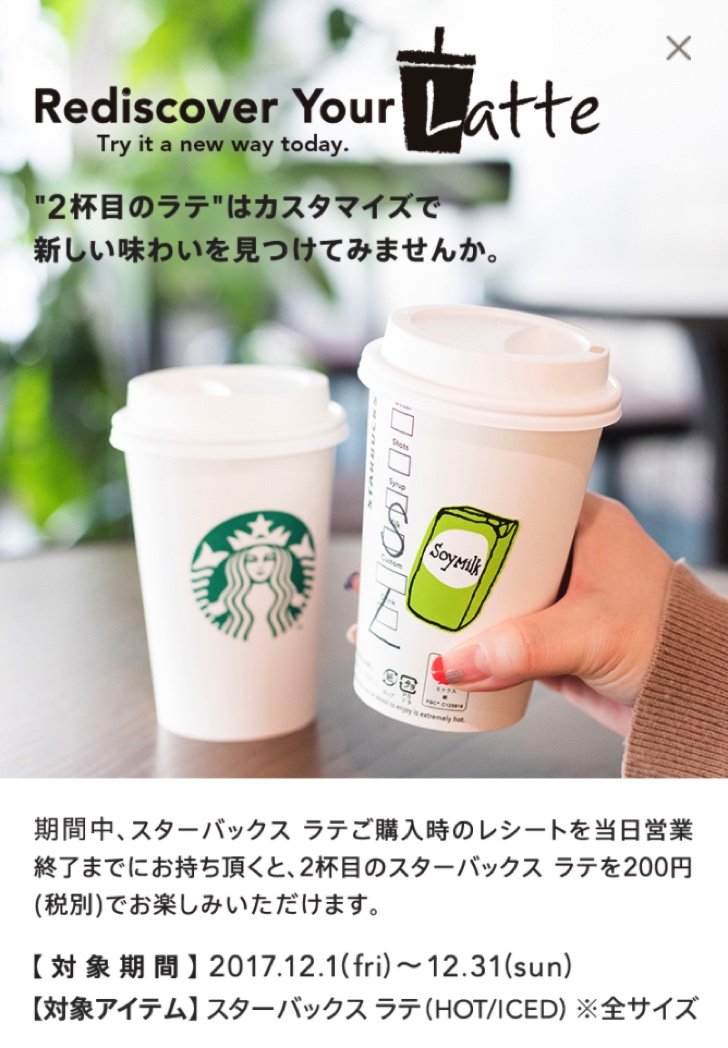 そのほか、スターバックスラテを購入したレシートを当日営業終了までに持参すると、2杯目のスターバックスラテを200円(税別)で楽しめます。12月31日(日)までの期間限定サービス。ラテのトールは通常370円(税別)なので2杯飲めば1杯あたり285円で飲める計算になるのでちょっとお得。
