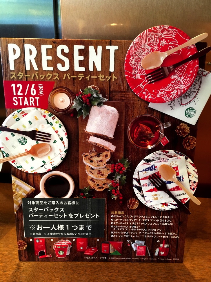 12/6(水)からスターバックスの各店舗でパーティセットプレゼントキャンペーンが始まります。対象商品をお買い上げの方にもれなく3種類のパーティセットのうち一つが貰えます。お皿、フォーク、スプーン、紙ナプキンのセット。どの柄もとってもカワイイ素敵なデザイン。対象商品お買い上げ一つにつきお一人様一つまでなので、複数欲しい方は何回かに分けて買わないと手に入りません。