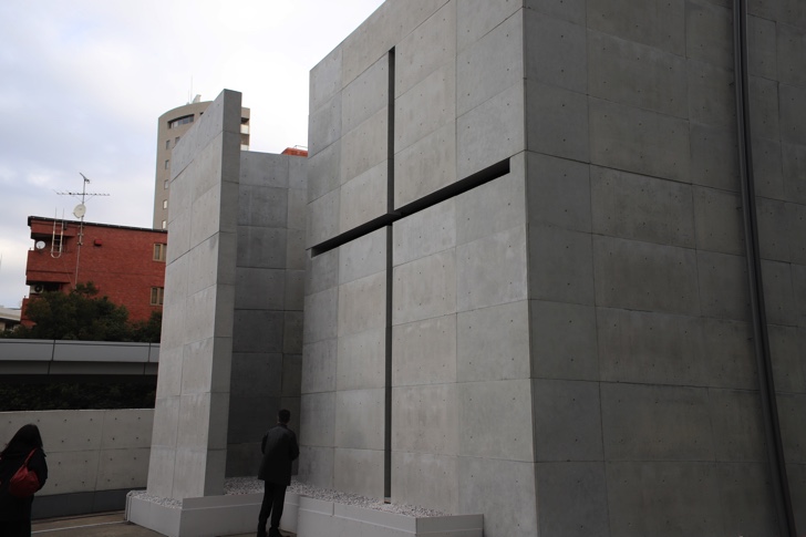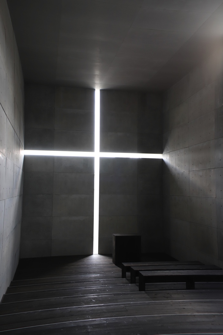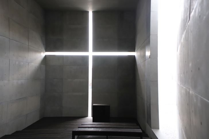 今回の企画展の目玉として大阪茨木市にある光の教会が会場に再現されていました。実物と全く同じものが作られており、実際に中に入ることができます。コンクリートに十字のスリットが入っているため、そこから光が漏れ、幻想的な雰囲気になっています。これを考えた安藤忠雄氏、マジ天才。