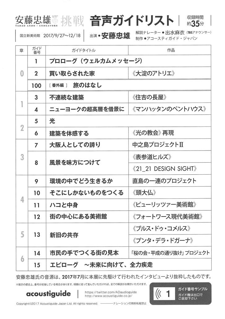 音声ガイドは安藤忠雄氏本人が語っているとのことで迷いなく借りました。間違いなく550円以上の価値はあります。この音声ガイドは絶対に借りることをオススメします。