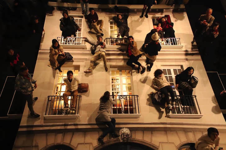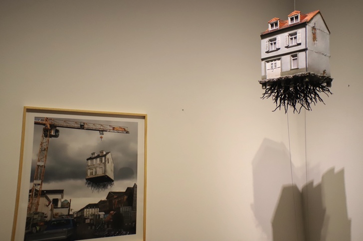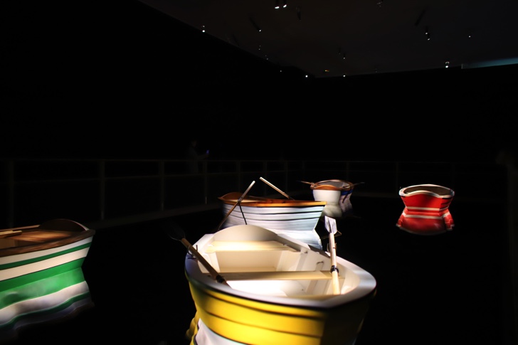 一見どこにでもある見慣れた風景ですが、よく見ると、水がないのに舟が浮かんでいたり、人々がさまざまなポーズで壁に張り付いていたりと、その異様な光景に観客は驚きと違和感を覚えることでしょう。