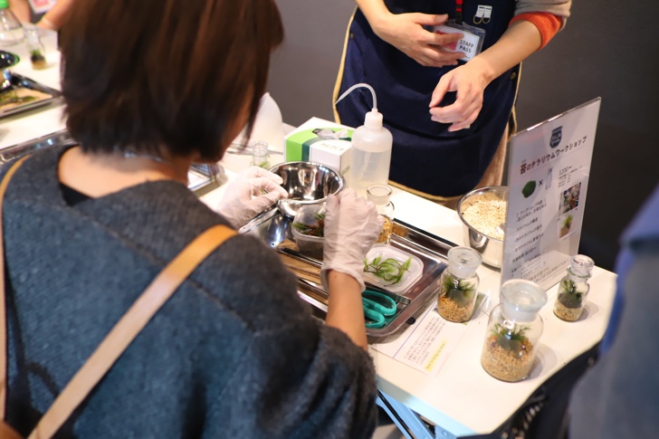 出口付近では瓶の中に苔をアートするワークショップを開催しています。今回は翌日もまだまだ行くところがあり荷物になるので参加しませんでしたが、とっても楽しそう。