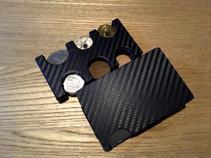 1円、5円、10円、50円、100円、500円それぞれのコインを簡単に保持できるケース。それまでは革のコインケースを使っていましたが、目的の硬貨を探すのが結構面倒。このコインケースなら一発で目的のコインを取り出すことができます。そのままではプラスチックで安っぽいので、カーボン風のシールを貼って高級感を出しています。