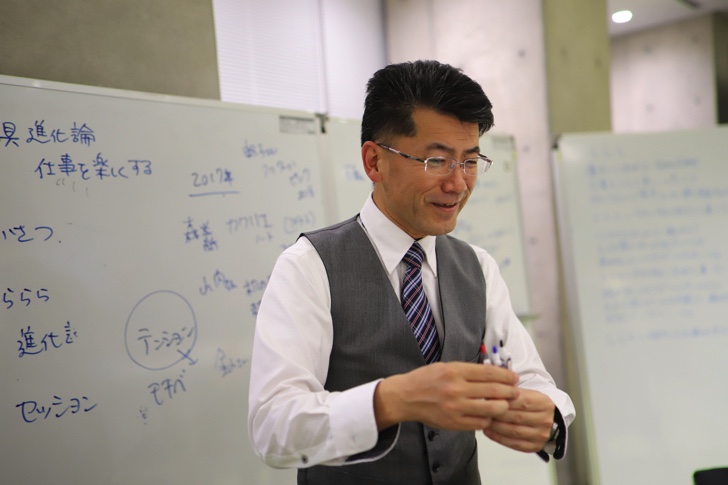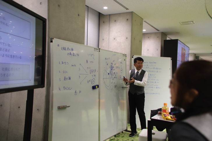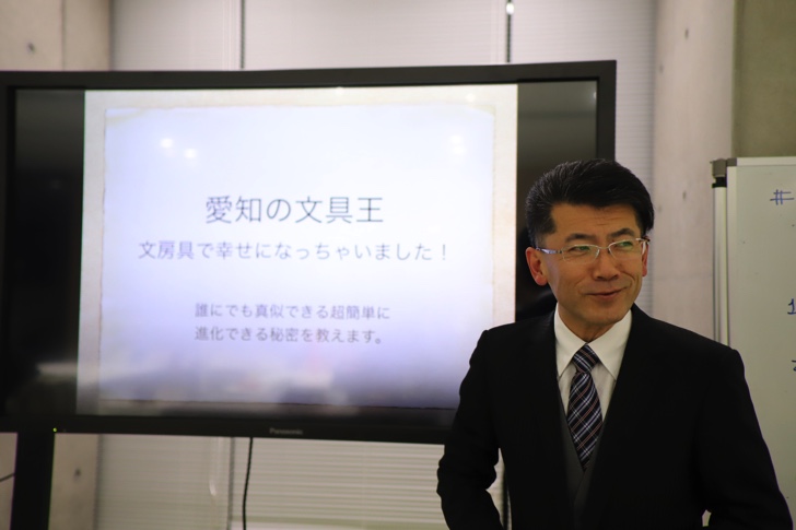 初めて訪れましたが、その豪華さと洗練されたデザインに驚くとともに、こんな場所で学べる学生を羨ましく思いました。昨今、大学は少子化により、このぐらいの充実した施設がないと生徒が集まらないので、とても充実しているとのこと。今回、フミヒロ氏のテーマは「文房具進化論 仕事を楽しくする文房具の話しをしましょう」ということだったのですが、前半は文房具というアイテムを戦略的に使って人生を楽しく生きてる話や運を良くするための話、ポジショニングの話など人生哲学的な話をされました。個人的にはとても興味ある話でとても楽しく聴くことができました。