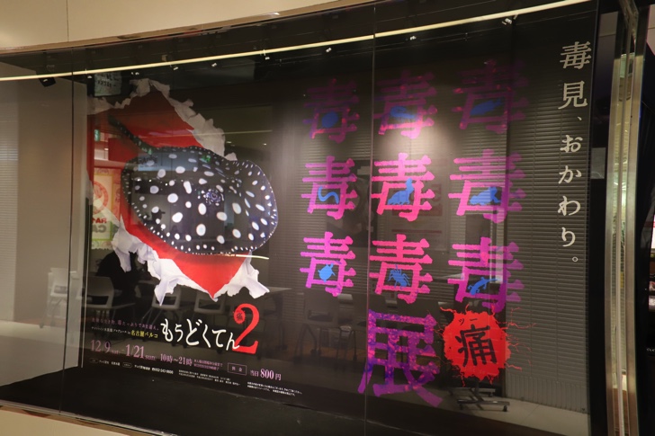名古屋パルコで開催中の毒毒毒毒毒毒毒毒毒展痛(もうどくてん2)に行ってきました。、2014年夏に開催されて大好評を博した「もうどく展」の第2弾。前回は「刺す」「咬む」「中毒」など、毒を持った生き物を展示して大変な反響を集め、池袋のサンシャイン水族館では94日間でおよそ20万人が来場する人気となりました。その第2弾が名古屋パルコで開催されるとのことで早速日曜日に立ち寄ったら二十人ぐらい入場待ちしていたので日を改めて平日の夜に伺いました。