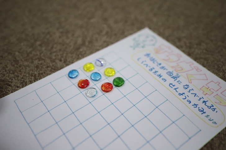 第2部は四角いマス目の中におはじきを並べて四角をつくって、数によってできるかどうかを実験しました。