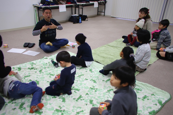 第3部はルービックキューブで模様をつくって遊びました。講師のトシちゃんの娘さんは小学4年生なのですが、どんな状態からでもルービックキューブをあっという間に6面揃えられます。模様を作った後、戻すのを失敗したルービックキューブは彼女に渡せば30秒ほどで綺麗に6面揃って戻ってきます。攻略法があるらしいのですが、いやはやすごい。