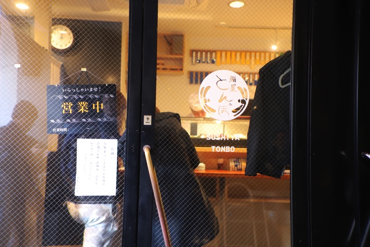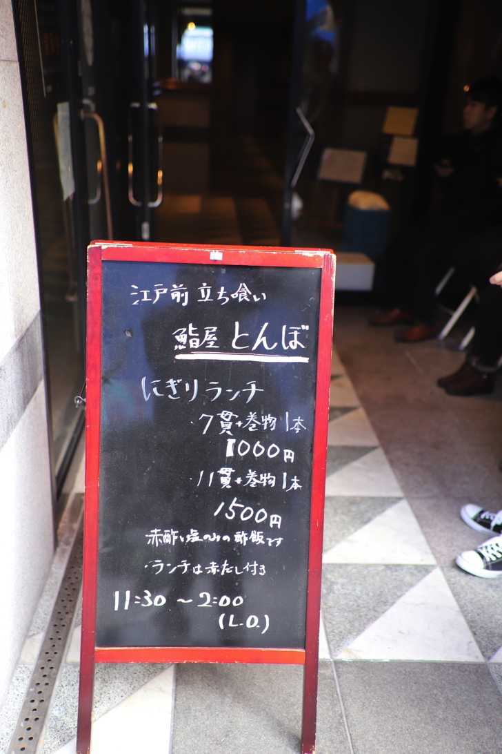新栄にある立ち食い寿司の「鮨屋とんぼ」。一昨年に開店した当時は長蛇の列ができていましたが、最近はやや落ち着きました。今回、開店時間の11時30分に着いたら1巡目が入った後4名待ちの状況。中に入ったのは12時過ぎだったので、平日にも関わらず30分待ったことになります。後ろには8名ほど並んでいました。