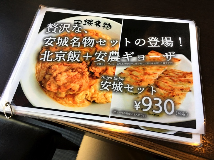 食べた後、ニンニクが臭ってもいいのであれば、北京飯と安農餃子がセットになった安城セット930円がイチオシ。
