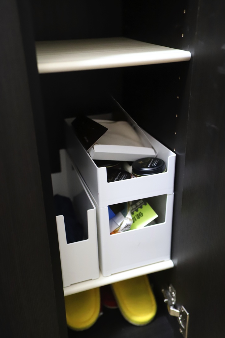 収納するケースはカインズホームにちょうどいい大きさのケースがありました。自宅の下駄箱にぴったり入ります。簡単に取り出すことができ、とても便利。
