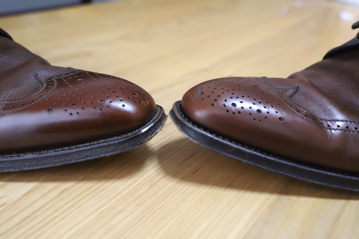 茶色の靴は先端だけが光沢が出るよう、かなり磨き込んでみました。もっとピカピカになるはずですが、あまり光っているのもやらしいような気がするので、ちょっと控えめにしています。左側が光沢仕上げした状態。右側はこの後、同じように仕上げました。これだけ違いがあります。