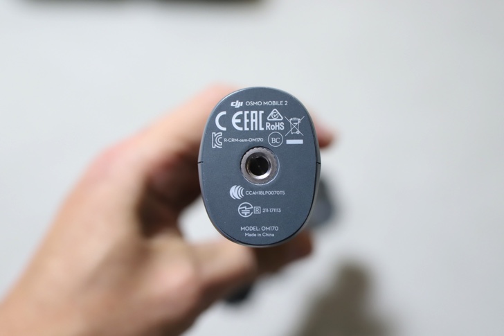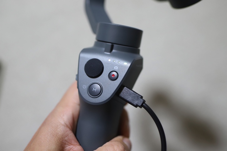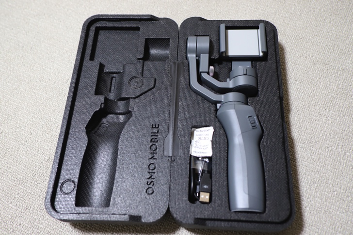 蓋を左右に開けると「DJI OSMO MOBILE2」が登場!USBのケーブルが同梱されています。質感は強化プラスチック製のため、ややチープな印象を受けますが、使用するには全く問題ありません。旧機種よりかなり軽くなっています。