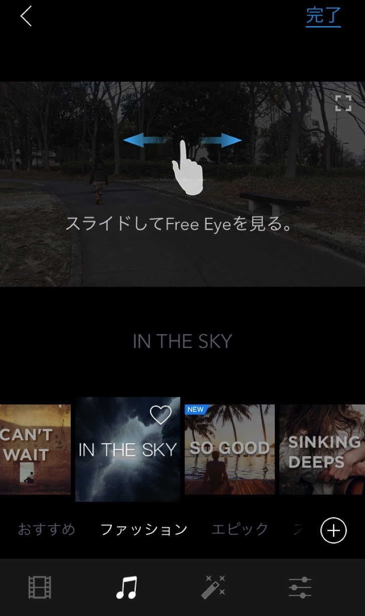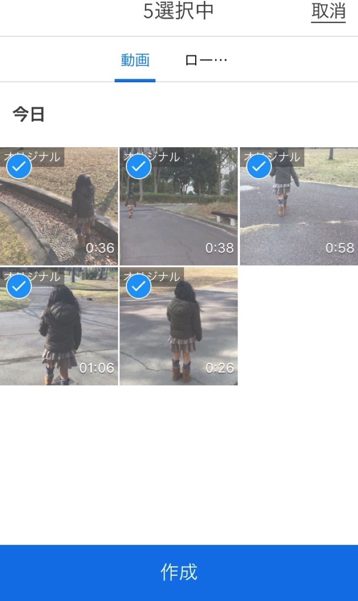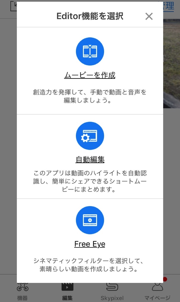 撮影は「DJI GO」アプリで行います。撮影した動画はアプリ内で管理され、簡単な編集ができます。手動で編集することも可能ですが、撮影した動画をいくつか選択し30秒前後に自動編集してくれる機能があります。