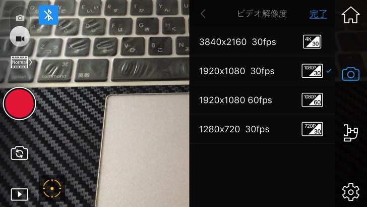 アプリ内の設定で動画の解像度は4段階に変更可能。4K動画の撮影もできますが、保存容量が大きくなりますので、個人的にはHD解像度で充分。
