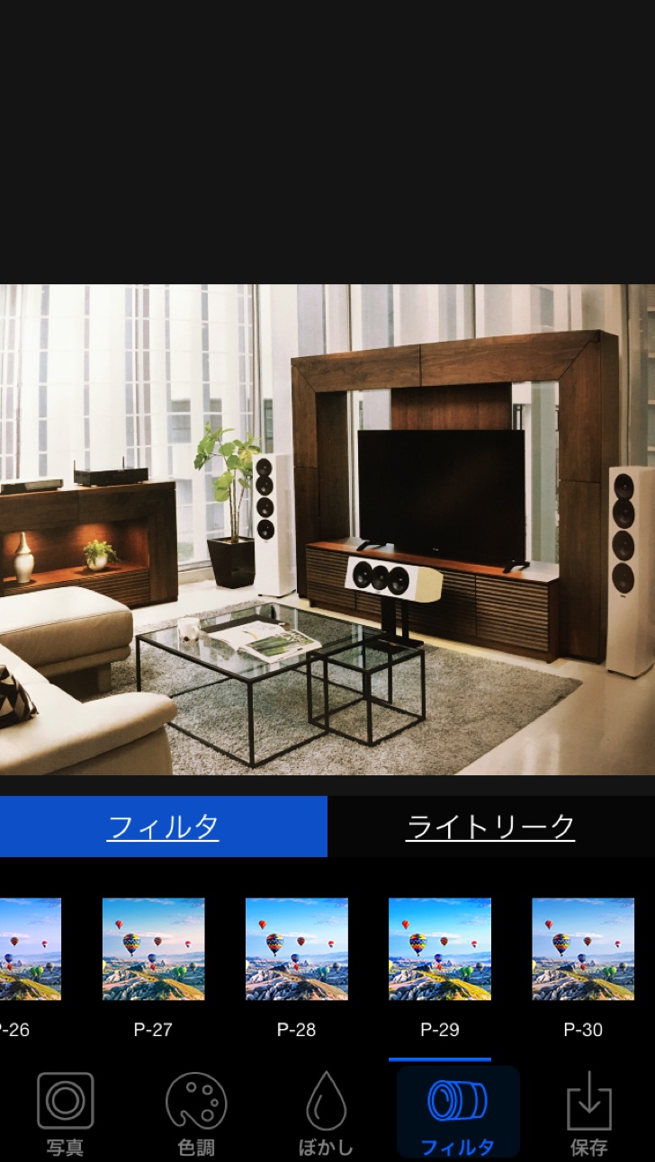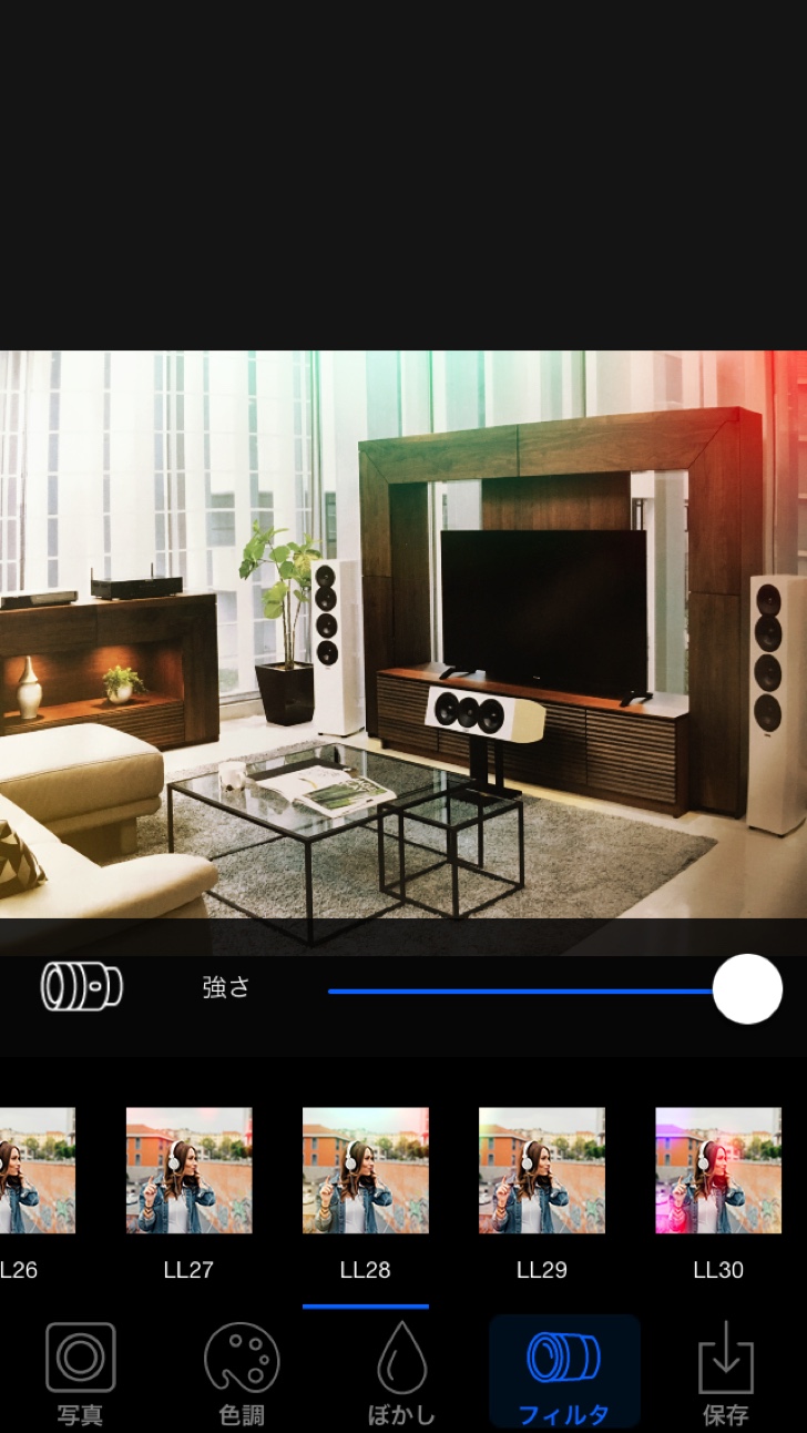 「フィルタ」の中にはカラーフィルタとライトリーク(逆光で撮影した時のフレアを再現する機能)があり、それぞれ30種類搭載されています。強さもスライダーで調整可能。