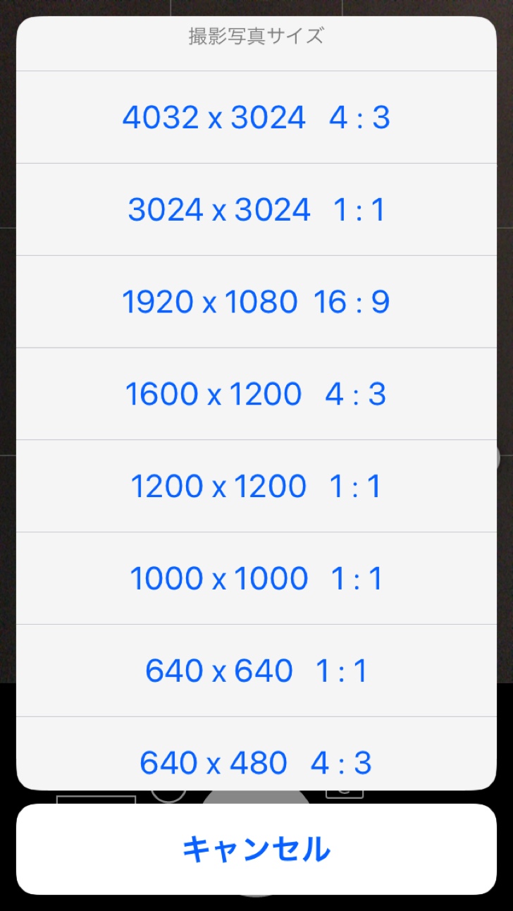 撮影の解像度や縦横比も色々選ぶことができます。インスタ用に1:1のサイズで4つの解像度が選択可能。