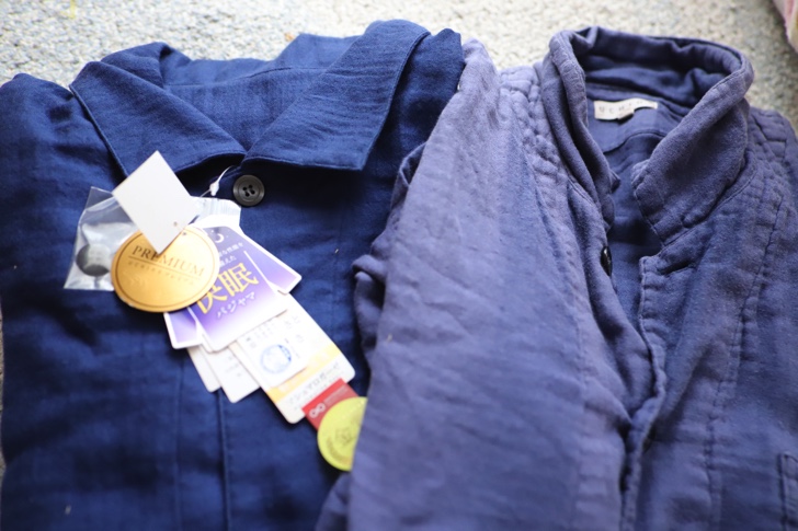 この二つのパジャマ、最初の色は全く同じ色なのですが、洗濯と日光でこんなに違う色になりました。